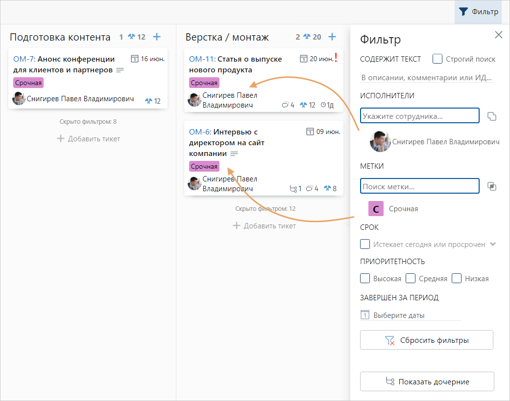 СОВЕТ. Чтобы быстро установить фильтр, используйте горячие клавиши: •CTRL+КЛИК по исполнителю или метке – отобразить тикеты; •CTRL+SHIFT+КЛИК по исполнителю или метке – скрыть тикеты |