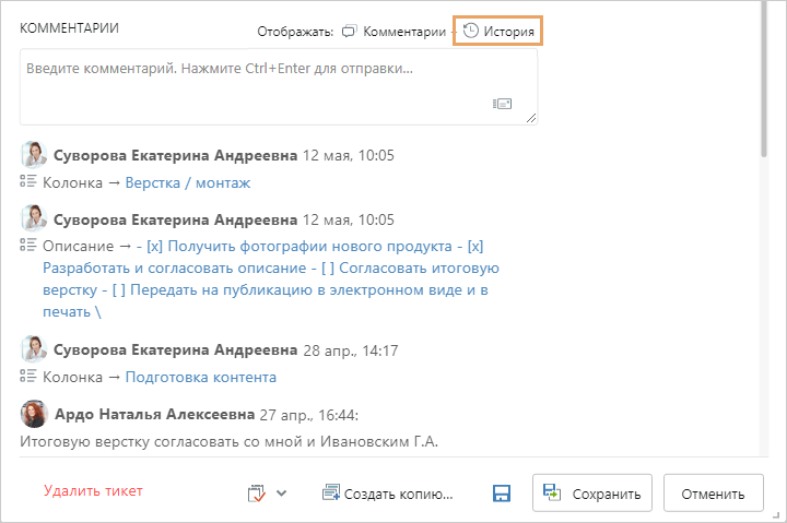 Чтобы просмотреть изменения, которые вносились в тикет, нажмите История: