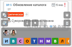 Также с помощью меню можно добавить метку или исполнителя. Для выбора доступны метки и сотрудники, которые назначены хотя бы в одном тикете на доске. Прокрутить список можно колесиком мыши.