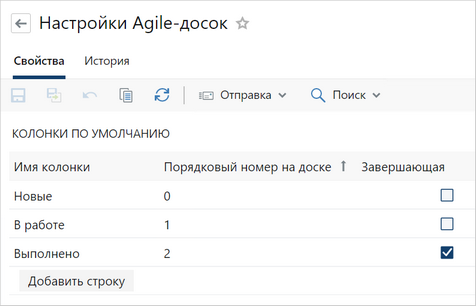 2.В табличной части «Колонки по умолчанию» проверьте имена и порядковые номера колонок, которые будут создаваться для новых досок. При необходимости измените текущие значения или добавьте новые по кнопке Добавить строку: