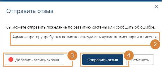 В результате отправляется письмо с отзывом, в которое вкладывается запись экрана. Если система установлена локально, то письмо получает администратор. Если вы работаете в облаке, то письмо приходит в службу поддержки Directum RX.