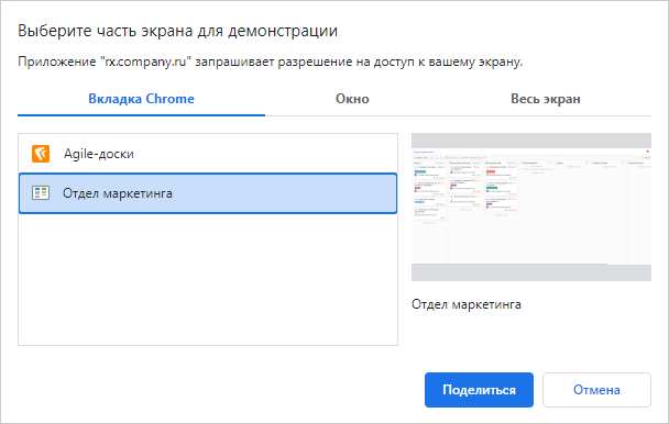 3.При необходимости приложите к отзыву видео с записью экрана. Для этого нажмите на кнопку Добавить запись экрана. После этого открывается окно выбора области для записи, внешний вид которого зависит от используемого браузера. Пример окна в Google Chrome: