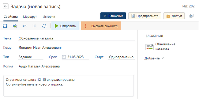 выберите пункт Вложением в задачу. В результате откроется карточка задачи: