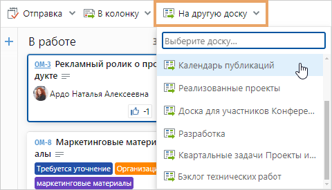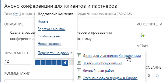 Тикет можно перенести на другую доску, например, если работы по нему переданы в другую команду. Для этого воспользуйтесь одним из способов: