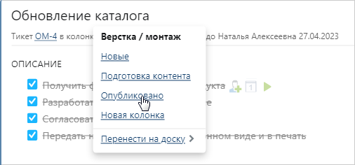 Информация о переносе сохраняется в истории тикета. СОВЕТ. Чтобы быстро перенести тикет в завершающую колонку, щелкните по нему правой кнопкой мыши либо нажмите на кнопку