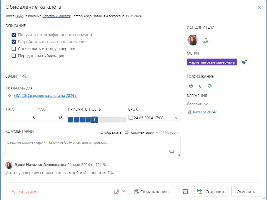 Если доска привязана к проекту, то в поле автоматически отображается сумма утвержденных отметок трудозатрат на тикет. При необходимости это значение можно скорректировать вручную. Чтобы вернуть автоматический расчет, нажмите на кнопку Трудоемкость. Укажите целое число, которое отражает затраты сотрудника на выполнение работ в принятых компанией единицах измерения, например, в часах. Приоритетность. Важность работ по шкале от 0 до 10. Чтобы указать приоритетность, выберите нужное количество клеток. От приоритетности зависит, какая важность устанавливается в созданной из тикета задаче: высокая или обычная. Срок выполнения работ. Комментарии о ходе работ по тикету: •чтобы сохранить комментарий, нажмите на кнопку Отправить или используйте горячие клавиши CTRL+ENTER; •чтобы изменить или удалить свой комментарий, используйте кнопки Исполнители. Укажите сотрудника, который будет отвечать за выполнение работ по тикету. Для этого нажмите на кнопку Примечание. По умолчанию отображаются только действующие сотрудники. Чтобы включить в список закрытые записи сотрудников, например тех, кто уволился или находится в долгосрочном отпуске, нажмите Показать закрытые записи:
