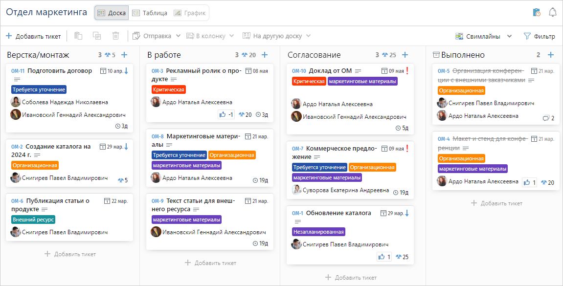 В результате на доске отображается краткая информация о работах, которая используется для их отслеживания. Чтобы получить детальную информацию, нажмите на нужный тикет: