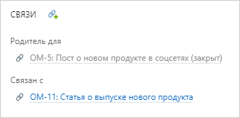 В результате в поле Связи добавляется ссылка на выбранный тикет. При этом: