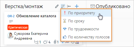 Порядок тикетов в колонке можно изменить, упорядочив их по одному из критериев: