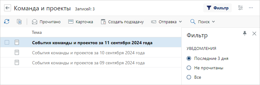 Сводные уведомления отправляются во Входящие, в папку потока «Команда и проекты»: