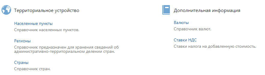 По умолчанию справочники уже заполнены. При необходимости внести в них изменения может администратор или сотрудники, входящие в роль «Ответственные за контрагентов». Например, добавить новый населенный пункт или валюту.
