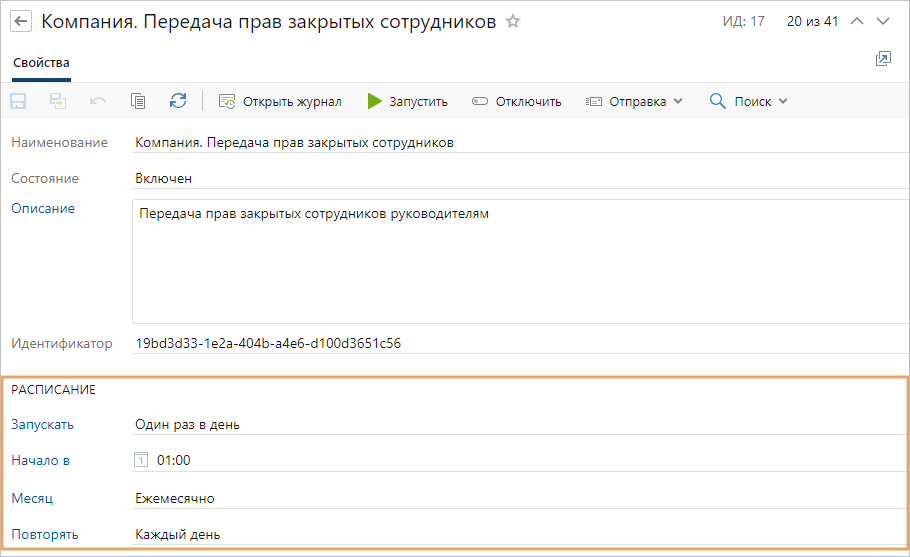 •«Компания. Передача прав закрытых сотрудников» – раз в сутки проверяет, появились ли закрытые записи сотрудников, права доступа которых нужно передать руководителю. На основе собранной информации создается очередь из системных замещений;