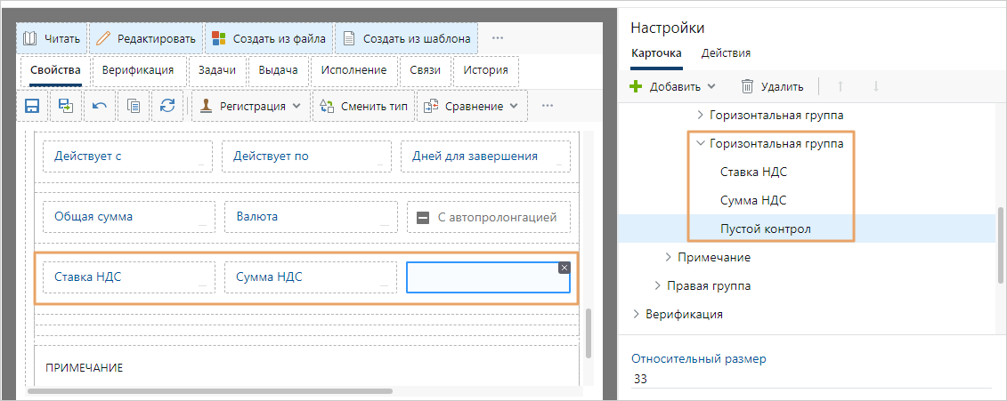 ПРИМЕЧАНИЕ. Контролы, которые добавлены в среде разработки, могут автоматически объединяться в группы «Горизонтальная группа» или «Вертикальная группа». Это необходимо для корректной разметки и отображения формы в веб-клиенте. Изменять положение таких групп нельзя, но в них можно добавлять и перемещать контролы. Также для правильной разметки автоматически создаются пустые контролы.