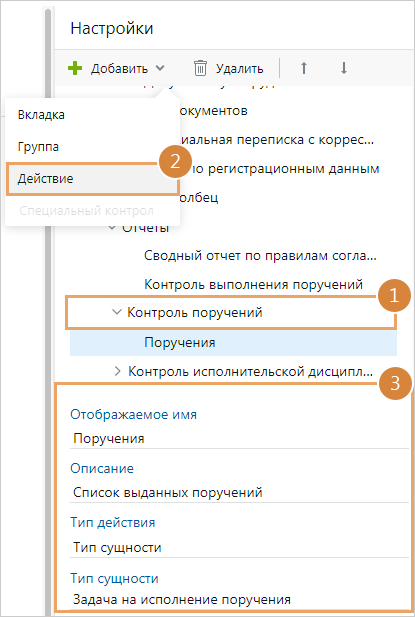 2.На панели действий нажмите на кнопку Добавить и выберите пункт Действие.