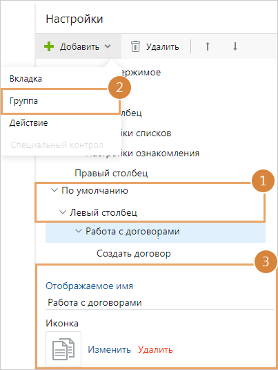 1.В дереве элементов выберите вкладку, а также столбец, в который нужно добавить группу: Левый столбец или Правый столбец.