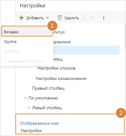 1.На панели действий нажмите на кнопку Добавить и в выпадающем списке выберите пункт Вкладка.