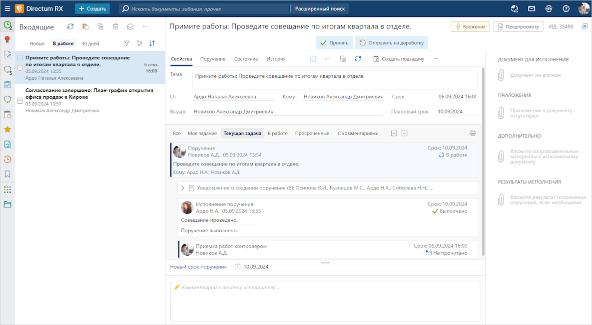 •в заданиях, где внимание руководителя должно быть сосредоточено на содержимом документа, он открыт на предпросмотр в центре экрана. Например, задание на согласование документа выглядит следующим образом: