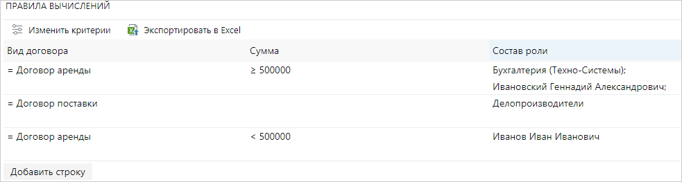 Заполнение таблицы принятия решений рассмотрим на примере вычисляемых ролей. Предположим, необходимо определять согласующих договора в зависимости от его вида и суммы. Для этого: