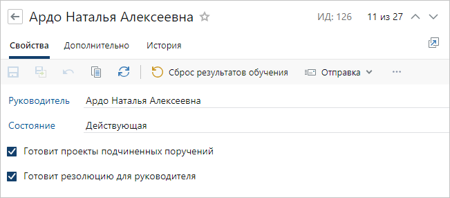 3.В карточке на вкладке «Свойства» заполните поле *Руководитель и установите флажки: