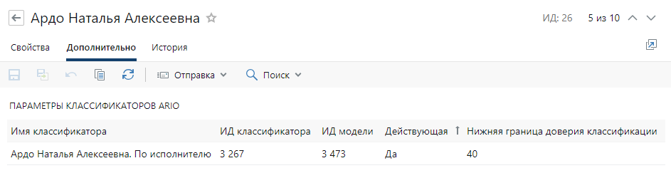 5.Когда для виртуального помощника создается классификатор, в карточке записи справочника на вкладке «Дополнительно» отображается информация о созданном классификаторе: