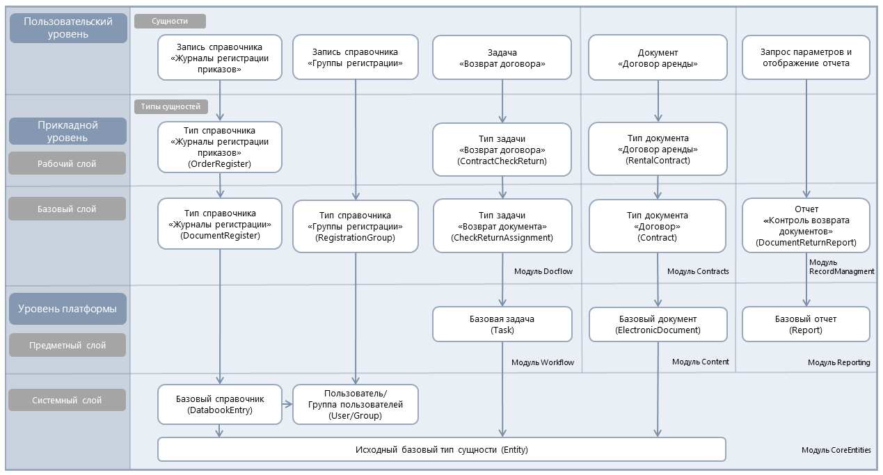 На системном слое определен базовый тип сущности, на предметном слое – тип сущности «Документ». На базовом слое разработчик может на основе документа создать тип сущности «Договор». Затем на рабочем слое от договора создать конкретные типы договоров – договор аренды, трудовой договор и другие. На пользовательском уровне сотрудник работает с карточкой договора аренды.