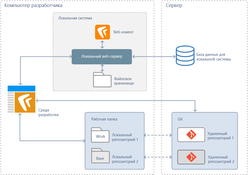 •среда разработки Directum RX, в которой разработчик модифицирует систему. Все изменения исходных кодов сохраняются в локальном репозитории Work. Чтобы проверить изменения, разработчик собирает и публикует решения в локальную систему. Проверенные изменения разработчик отправляет в удаленный репозиторий на сервер Git, чтобы они стали доступны другим разработчикам;