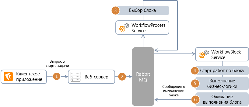 Очередь сообщений обеспечивает надежность доставки сообщений сервисам Workflow. Если нужный сервис Workflow выключен или загружен, запрос на старт задачи выполняется позже. Таким образом, время отклика для конечного пользователя при старте задачи не зависит от загруженности сервисов Workflow.