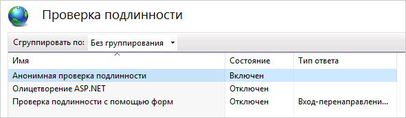 9.На начальной странице сайта в секции IIS выберите пункт Проверка подлинности. Откроется страница «Проверка подлинности». Убедитесь, что: