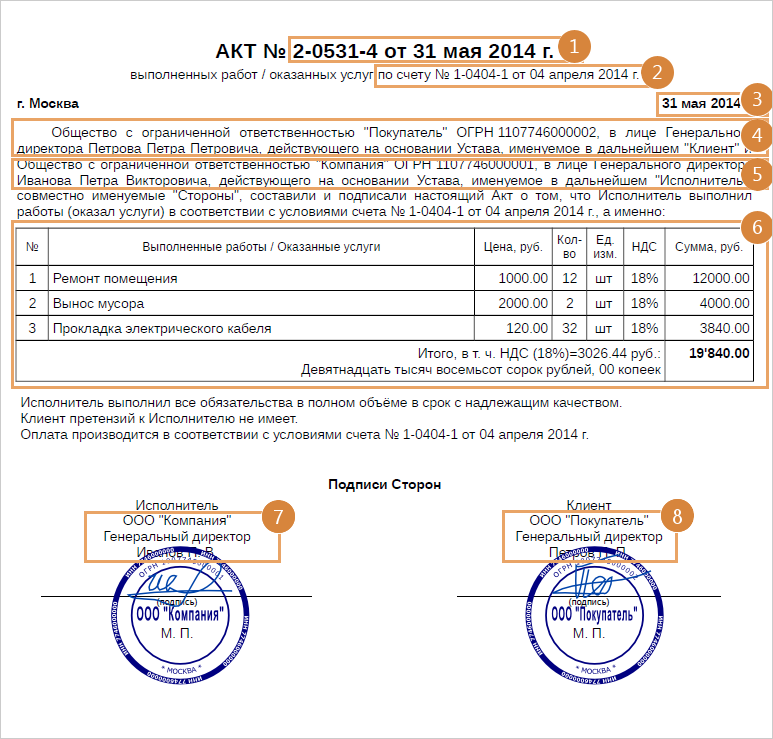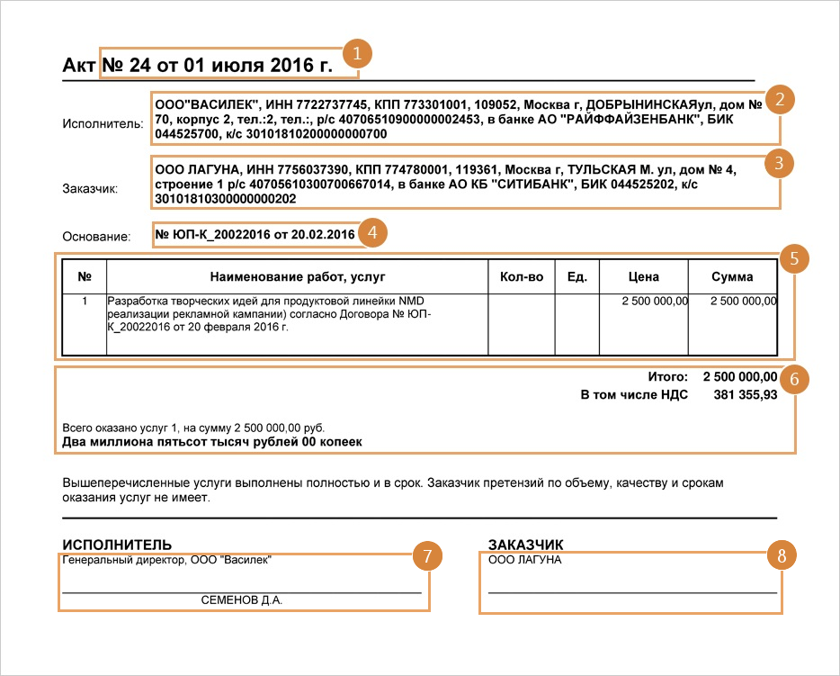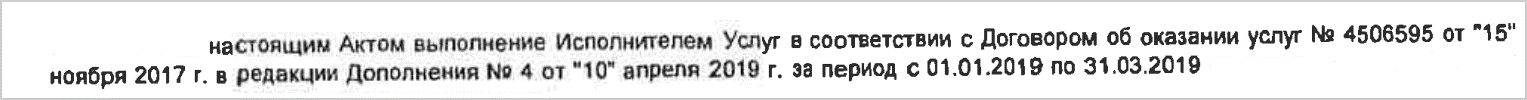 Пример 1. Расположение значимых фактов в акте унифицированной формы: 1.Номер и дата документа. 2.Реквизиты исполнителя. 3.Реквизиты заказчика. 4.Реквизиты документа-основания. 5.Перечень работ и услуг. 6.Сумма документа, сумма НДС, валюта суммы. 7.Реквизиты подписанта исполнителя. 8.Реквизиты подписанта заказчика. Пример 2. Расположение значимых фактов в акте свободной формы: 1.Номер и дата документа. 2.Реквизиты документа-основания. 3.Дата документа. 4.Реквизиты заказчика. 5.Реквизиты исполнителя. 6.Перечень работ и услуг. 7.Реквизиты подписанта исполнителя. 8.Реквизиты подписанта заказчика. |