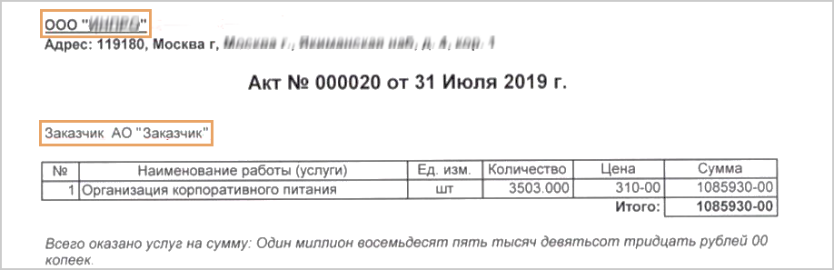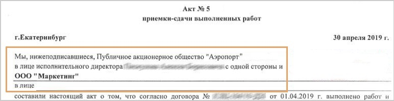 6.Не размечайте факты в поле Основание, если это только наименование документа. Например, Договор, Счет, Основной договор. 7.Номер и дата документа-основания могут указываться в заголовке акта без ключевого слова Основание. 8.Документ, на основании которого действует представитель от лица заказчика/исполнителя, не является документом-основанием для текущего. Контрагенты 1.В документе явно может быть указан только заказчик. Определяйте его по ключевому слову Заказчик. Другая организация в акте является исполнителем и может указываться в верхней части документа: