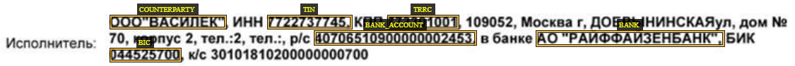 •если разметка выполняется для дообучения однофактовой модели, то в подготовленных документах достаточно разметить только новые типы фактов; •если разметка выполняется для дообучения многофактовой модели, то в документе необходимо размечать все факты: текущие и новые. Чтобы определить тип модели, выполните GET-запрос «Информация о модели» и изучите ответ в параметре description. ВАЖНО. Извлечение фактов из таблиц осуществляется только многофактовой моделью. Поэтому в письмах следует размечать все факты, а в документах с таблицами – на табличном слое все факты, на текстовом можно разметить только новые факты по аналогии с разметкой для однофактовой модели; •включайте в область все слова, которые входят в факт; •расстояние между фактом и границей области должно быть минимальным – не более 1 мм; •не вкладывайте размеченные области друг в друга. Допускается пересечение размером менее половины меньшей области; •размечайте только сам текст факта. Ключевое слово факта не размечается; •включайте в область знаки препинания, сокращения, аббревиатуры или символы, если они написаны слитно с фактом; •в мультиязычных документах, например, договорах с иностранными компаниями, размечайте факты на всех используемых в них языках; •размечайте многострочные факты: •одним прямоугольником, если в размеченную область попадают только слова, являющиеся частью факта: