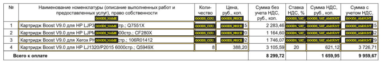 9.Ячейки таблицы, в которых содержится несколько значений, например сумма и сумма НДС, рекомендуется либо не размечать, либо создавать для таких ячеек отдельный атрибут. |