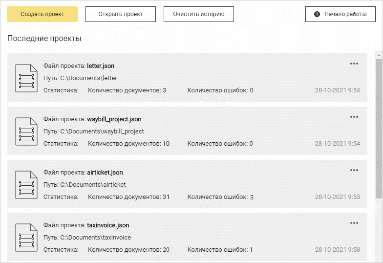 В результате проекты удаляются из истории приложения, но сохраняются в файловой системе. Если нужно вернуться к работе над удаленным из истории проектом, вновь загрузите его по кнопке Открыть проект.