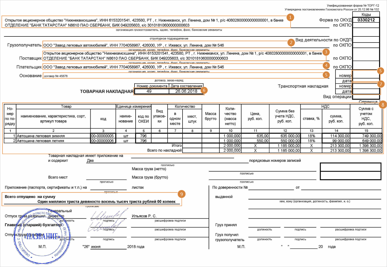 А также валюту, которая относится к итоговой сумме (в том числе НДС). 3.Сумма документа и сумма НДС могут располагаться на последней или предпоследней странице. Прочее 1.Если вместо номера документа и документа-основания указано «б/н», размечайте такой факт. 2.Номер и дата товарной накладной могут указываться несколько раз. Например, в верхней и нижней частях документа или на каждой странице, если документ многостраничный. В этом случае размечайте реквизиты, которые находятся в верхней части документа. 3.Размечайте остальные даты в документе как «Прочие даты». 4.Не размечайте табличную часть товаров и услуг. 5.Если в область разметки составного факта попадает подпись или печать, размечайте составной факт. Если подпись или печать накладываются на простой факт, не размечайте его. 6.В многостраничных документах реквизиты организаций, валюта, номера и даты товарной и транспортной накладных расположены так же, как и в одностраничных. |