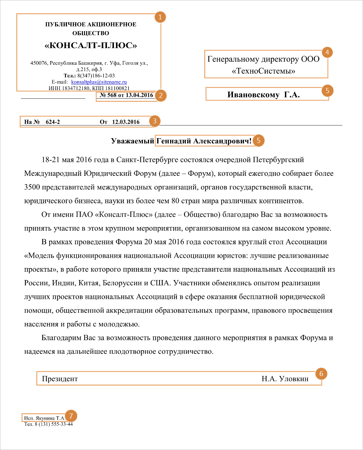 Пример 1. Расположение значимых фактов во входящем письме: 1.Реквизиты корреспондента. 2.Номер и дата документа. 3.Номер и дата исходящего письма «в ответ на». 4.Наименование получателя. 5.ФИО адресата. 6.ФИО подписанта. 7.ФИО исполнителя. Пример 2. Расположение значимых фактов во входящем письме: 1.Реквизиты корреспондента 2.Номер документа. 3.Дата документа. 4.Наименование получателя. 5.ФИО адресата. 6.Тема письма. 7.ФИО подписанта. 8.ФИО исполнителя. |