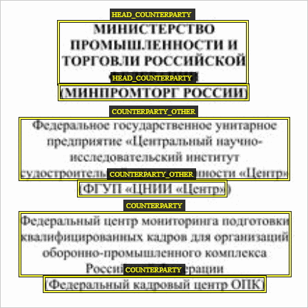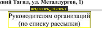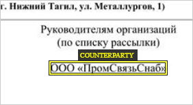 3.Размечайте все реквизиты организации в документе, даже если они дублируются в нескольких местах, например и в шапке, и в колонтитуле документа. 4.Размечайте наименование организаций в логотипе только в случае, если оно больше нигде не упоминается. Получатель 1.Размечайте все указанные в документе организации-получатели как «Реквизиты организации-получателя». Обобщающее наименование получателя размечается так же: