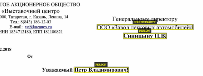 2.Размечайте обращение к адресату как отдельный составной факт «Реквизиты организации-получателя». При этом ФИО адресата размечайте как «ФИО персоны»: