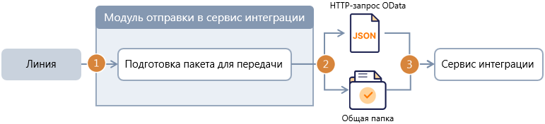 2.Модуль подготавливает пакет документов к передаче в сервис интеграции. Метаданные передаются по протоколу OData. Для отправки файлов ввода можно выбрать один из способов: в теле запроса или через общую папку. Если выбран второй вариант, модуль копирует файлы ввода в общую папку.