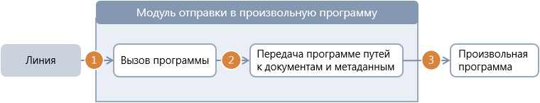 Модуль передает захваченные и упакованные документы в произвольную программу. Модуль работает с исполняемыми файлами форматов EXE и BAT, а также скриптами.