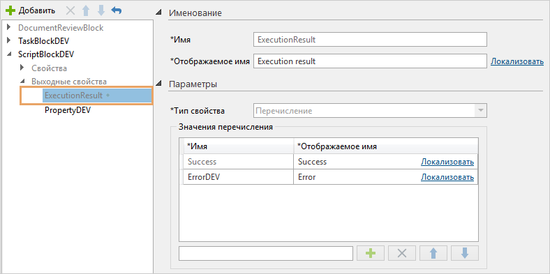1.В списке элементов блока перейдите в узел Выходные свойства, ExecutionResult и в параметрах добавьте новые результаты в виде значений перечисления. Например, для преобразования в PDF добавьте результат с ошибкой (Error):