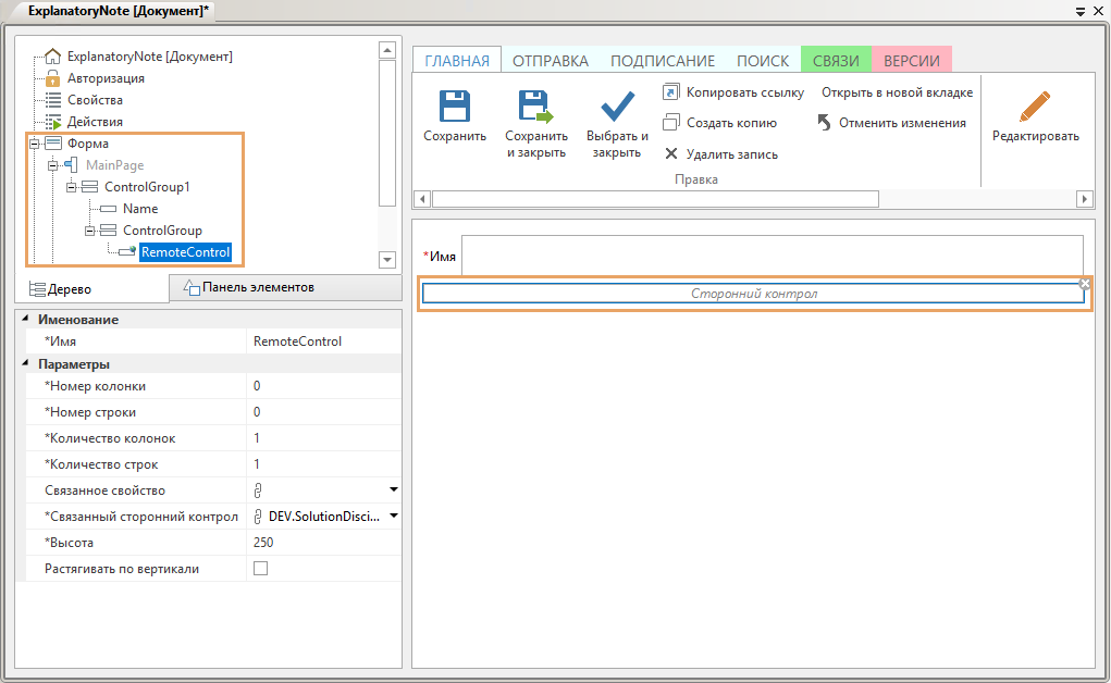 ПРИМЕЧАНИЕ. Чтобы добавить сторонний контрол на другую вкладку, выберите ее в дереве типа сущности.