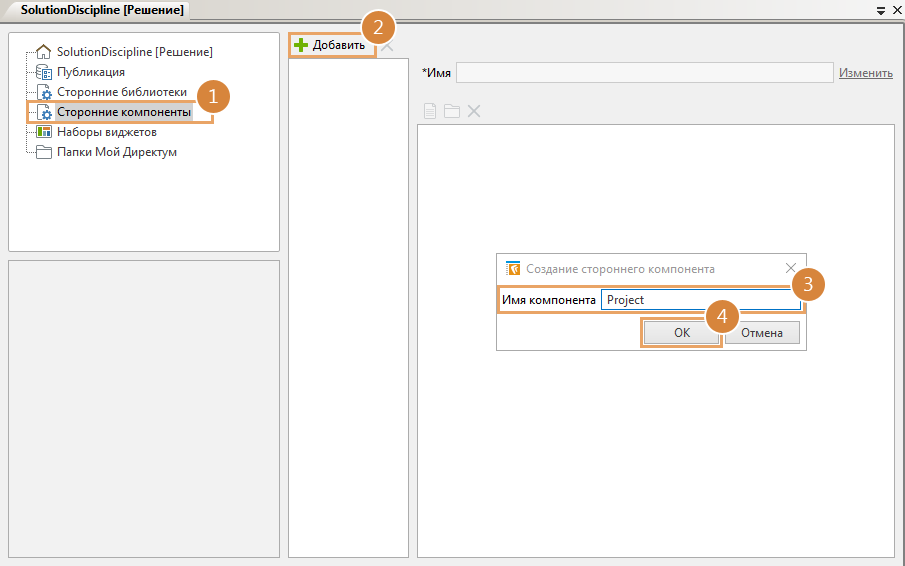 3.В среде разработки в редакторе решения добавьте новый сторонний компонент. Рекомендуется указать в названии номер версии, чтобы отличать от предыдущей.