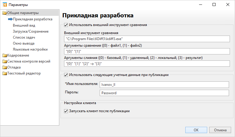 2.В узле Прикладная разработка установите флажок Использовать внешний инструмент сравнения и заполните поля: