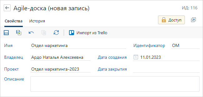 *Имя доски должно быть уникальным. На его основе автоматически формируется идентификатор. Совет. Доску можно импортировать из Trello. *Владелец. Сотрудник, ответственный за организацию и распределение добавляемых на доску работ. По умолчанию в поле указывается сотрудник, который создал доску. Проект, если в работе используется модуль «Проекты». После сохранения доска автоматически добавляется в папку указанного проекта. Если доска создается для организации работ вне проекта или для личного планирования, оставьте поле пустым. Идентификатор. Присваивается автоматически каждой доске при создании. На его основе формируется идентификатор для тикетов доски. При необходимости, измените идентификатор. Он может состоять из цифр, русских или английских букв. Максимальная длина – десять символов. Идентификатор можно изменить только до сохранения доски. |