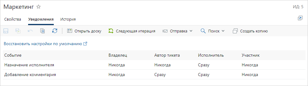 При создании следующей итерации или копии доски настройки уведомлений копируются и применяются к новой доске.