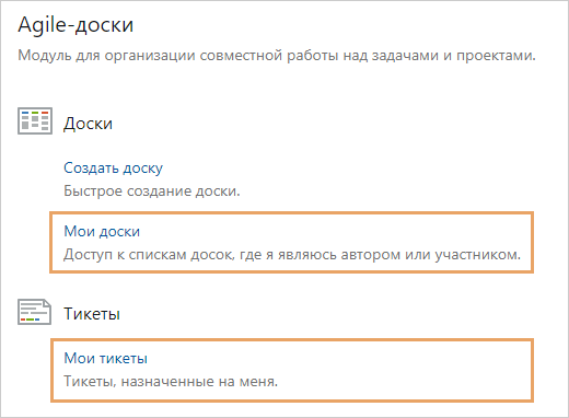 Работать с тикетами можно на Agile-доске или в списке «Мои тикеты». Чтобы перейти к нужной доске, используйте список «Мои доски». Списки расположены на обложке модуля «Agile-доски»: