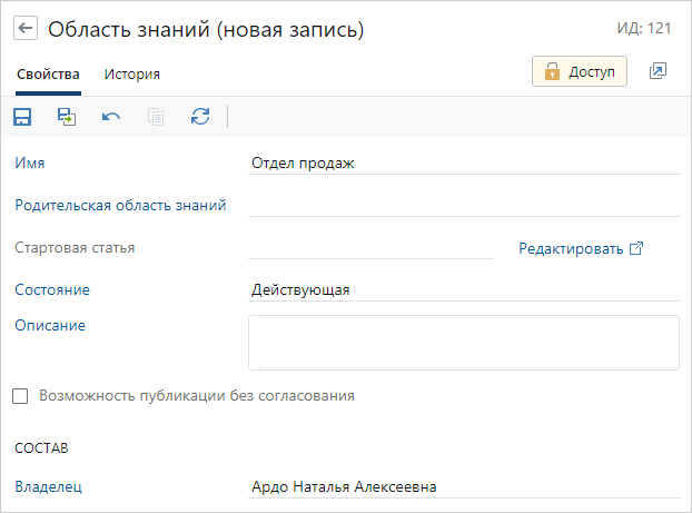 Примечание. Если не указать стартовую статью и сохранить карточку области, автоматически создается новая статья с названием «Стартовая статья для <Название области знаний>».