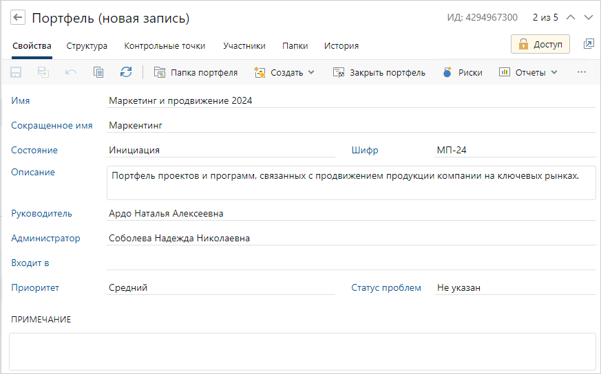 •чтобы включить текущий портфель в другой портфель, заполните поле Входит в. Для этого требуются права на изменение портфеля верхнего уровня;