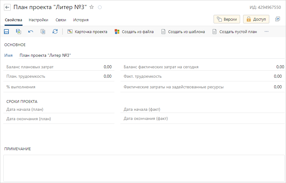 Примечание. Если по проекту уже создан план, при нажатии на кнопку План проекта открывается его карточка.
