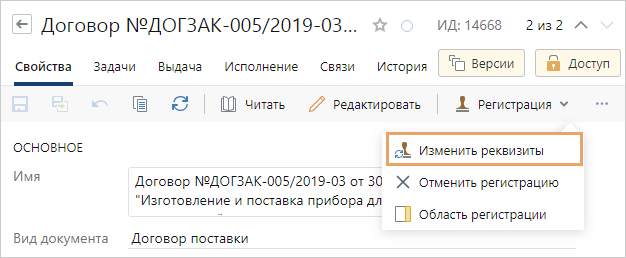 Изменение регистрационных данных документа может потребоваться, например, если необходимо доработать значения реквизитов.